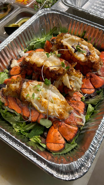 2 lobster tails, jumbo shrimp, mussels, little neck clams, mini potatoes, corn cob, fresh herbs and lobster broth.